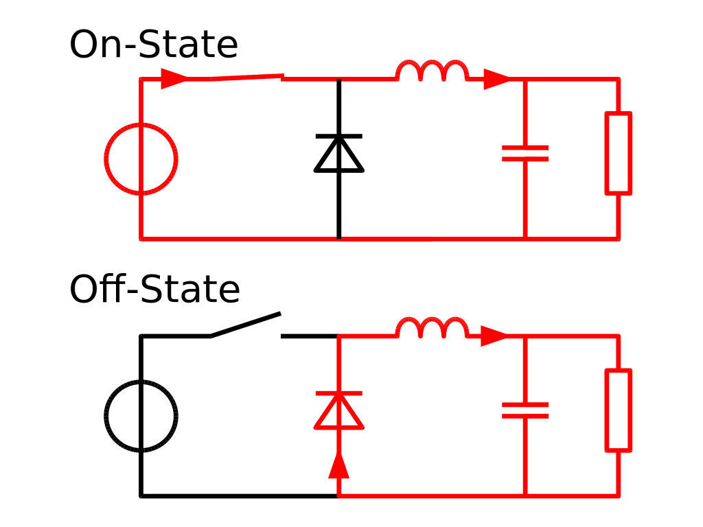 A Buck Converter is a DC/DC Converter which decrease voltage from input Voltage to output Voltage. It contains an IGBT or MOSFET, a diode, an inductor and a capacitor. Behavior of IGBT or MOSFET is the same as the switch. Buck Converter have 2 difference modes. One mode switch will be on and other mode, switch will be off. When the switch is turned on at that time, the current will be flow from supply through inductor to load and capacitor. When the switch is on, the inductor is charged opposite polarity of the input voltage. In other mode, the switch will be off. Now the charged inductor will be supplied with the same polarity. The current will be continued to flow from inductor through load or capacity to diode.