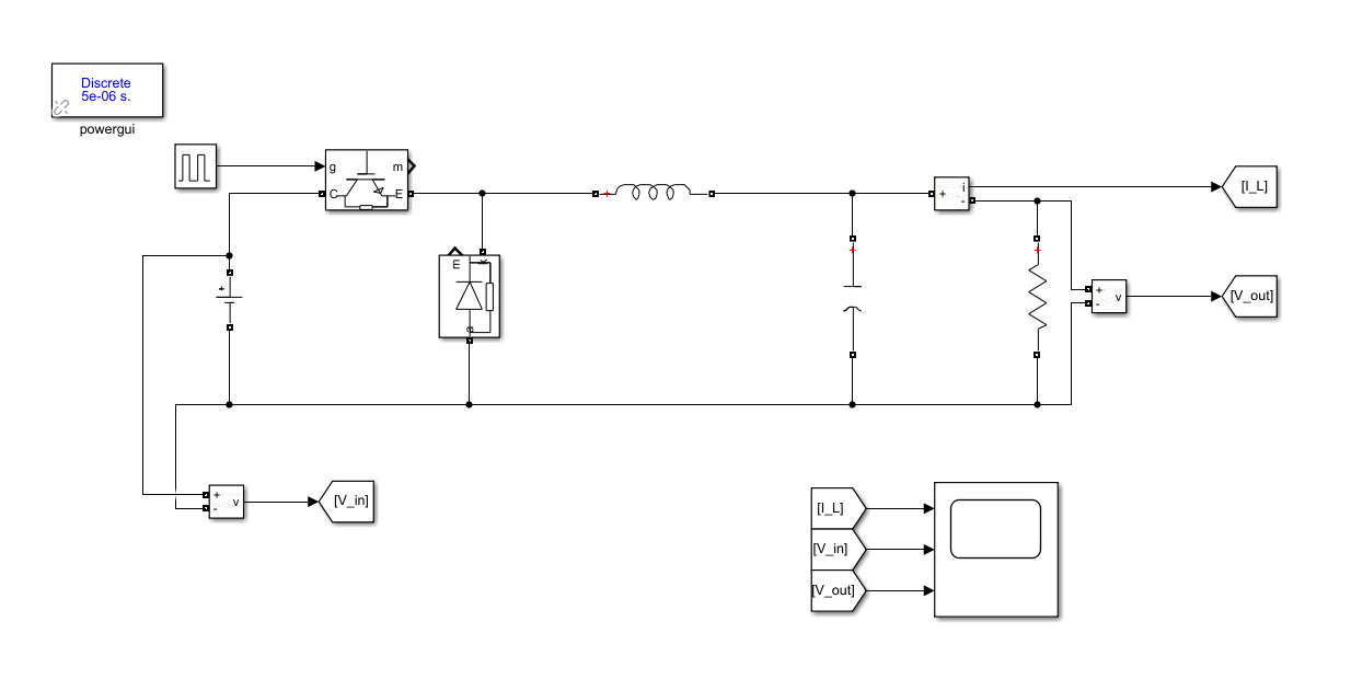 The Open Loop Buck Converter uses only simple pulse signals for gate signals. The pulse width is determined by how high the output voltage will be. Therefore, the pulse width is selected depending on how much output voltage you want.